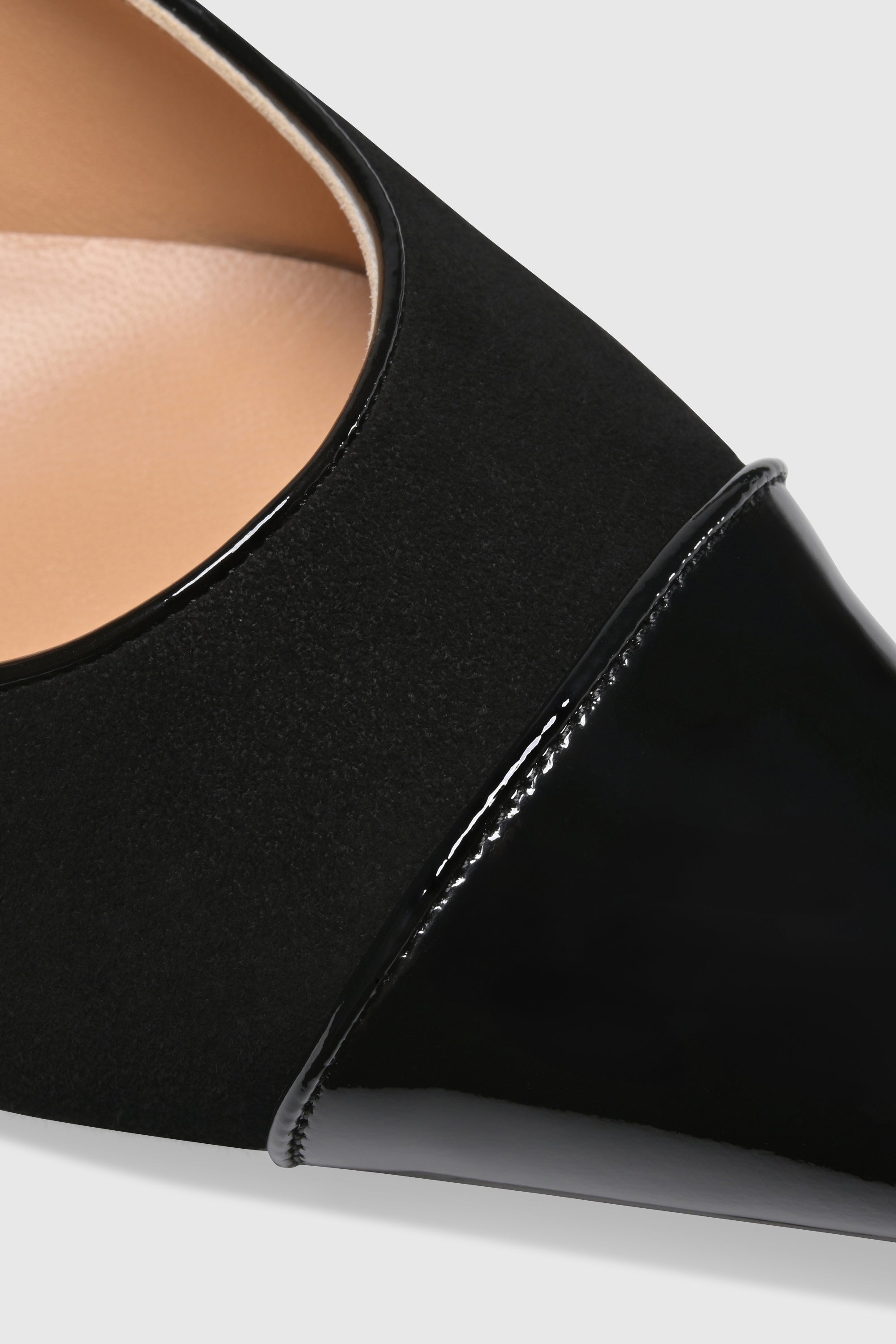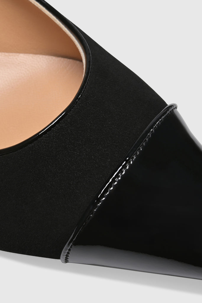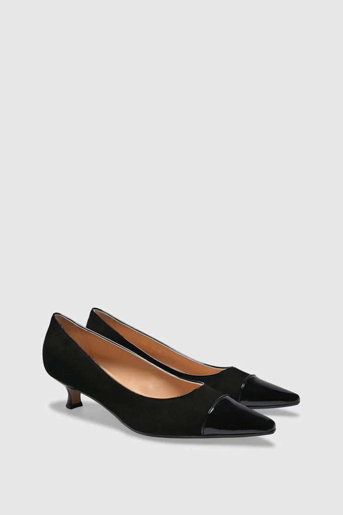 Der Pump 9458 Camoscio Vernice Black verfügt über eine zeitlose spitze Zehenform und ein kontrastierendes Zehenkappen-Detail aus Vernice-Leder. Der niedrige Kitten-Absatz hat eine leicht ausgestellte Form, die einen dezenten Auftrieb bietet. Das Zusammenspiel von Camoscio- und Vernice-Leder unterstreicht das klassische, elegante Design.