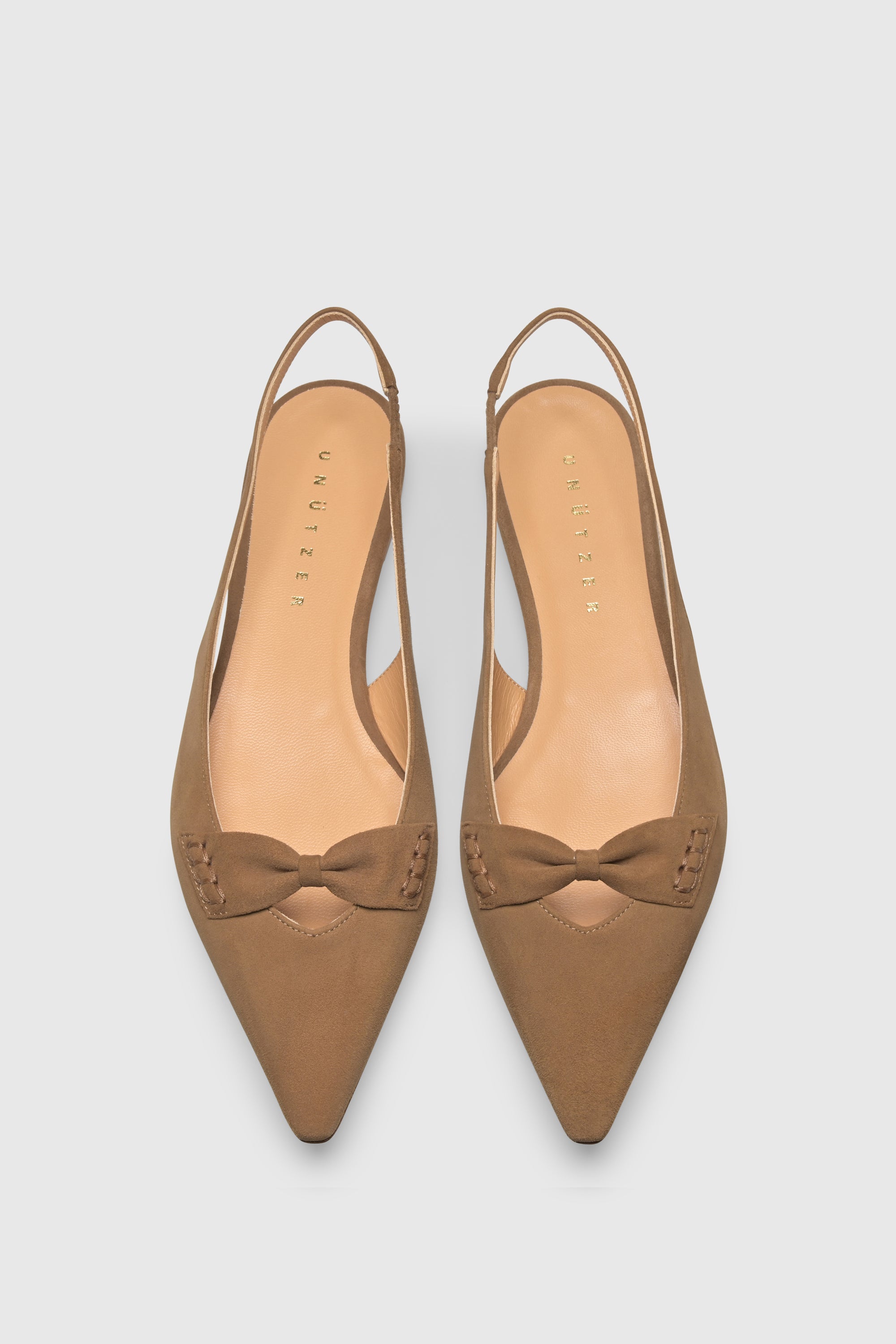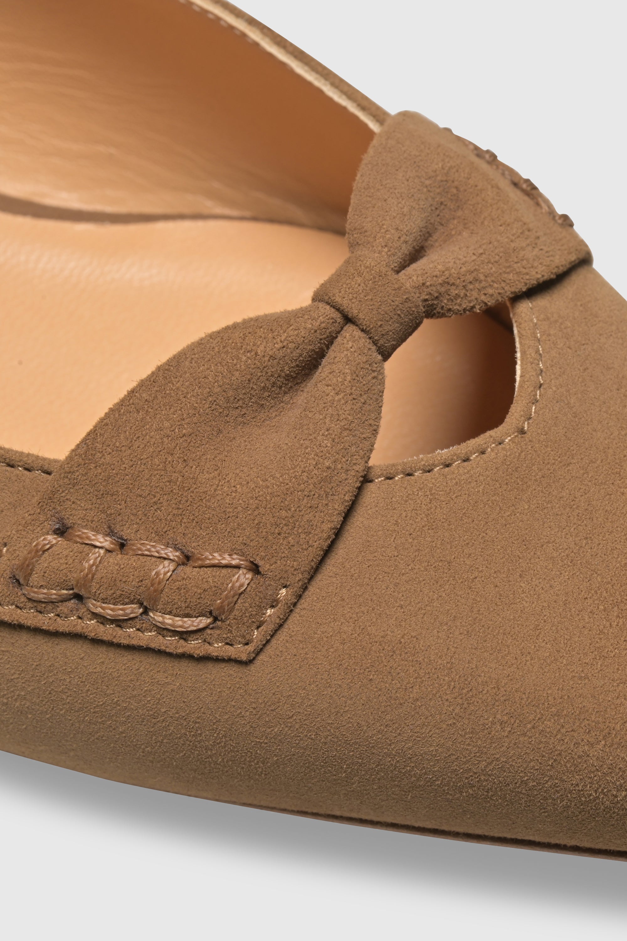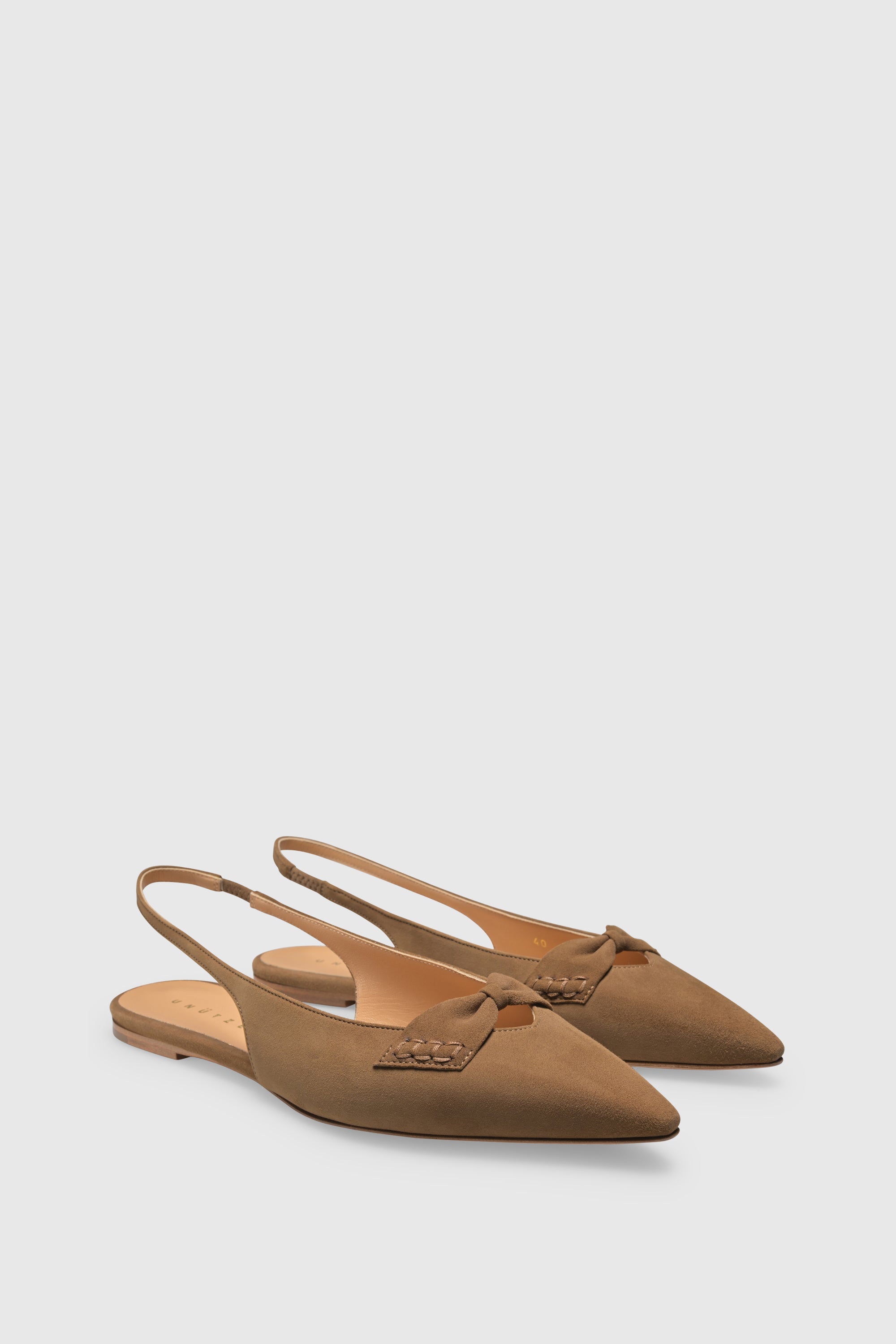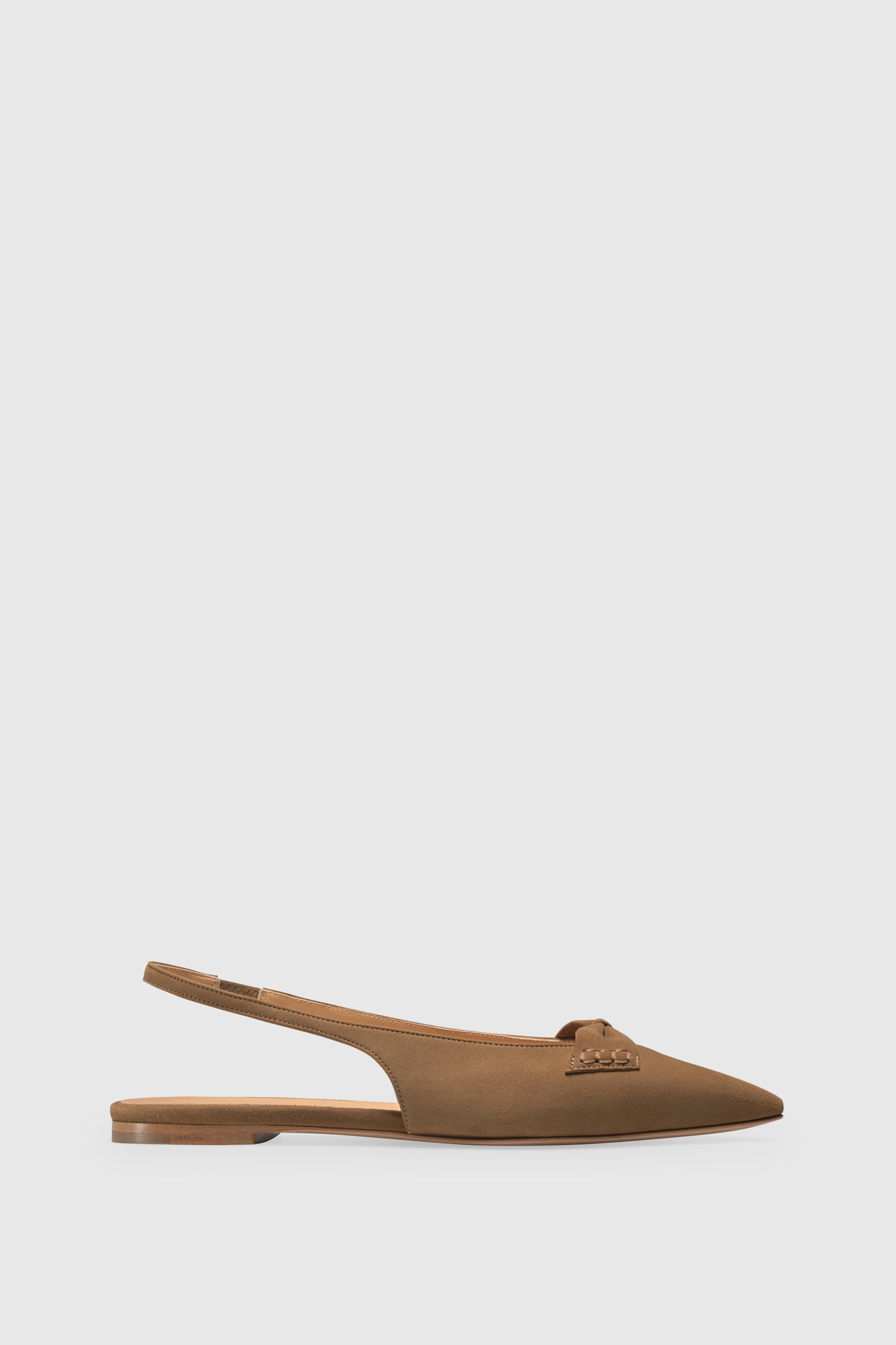 Der Slingback 9571 Camoscio Taupe wird in Italien aus weichem Wildleder handgefertigt. Als Slingback-Flat gestaltet, verfügt er über eine spitze Zehenform, ein Lederschleifendetail sowie einen Slingback-Riemen mit elastischem Einsatz für einen sicheren und flexiblen Sitz.