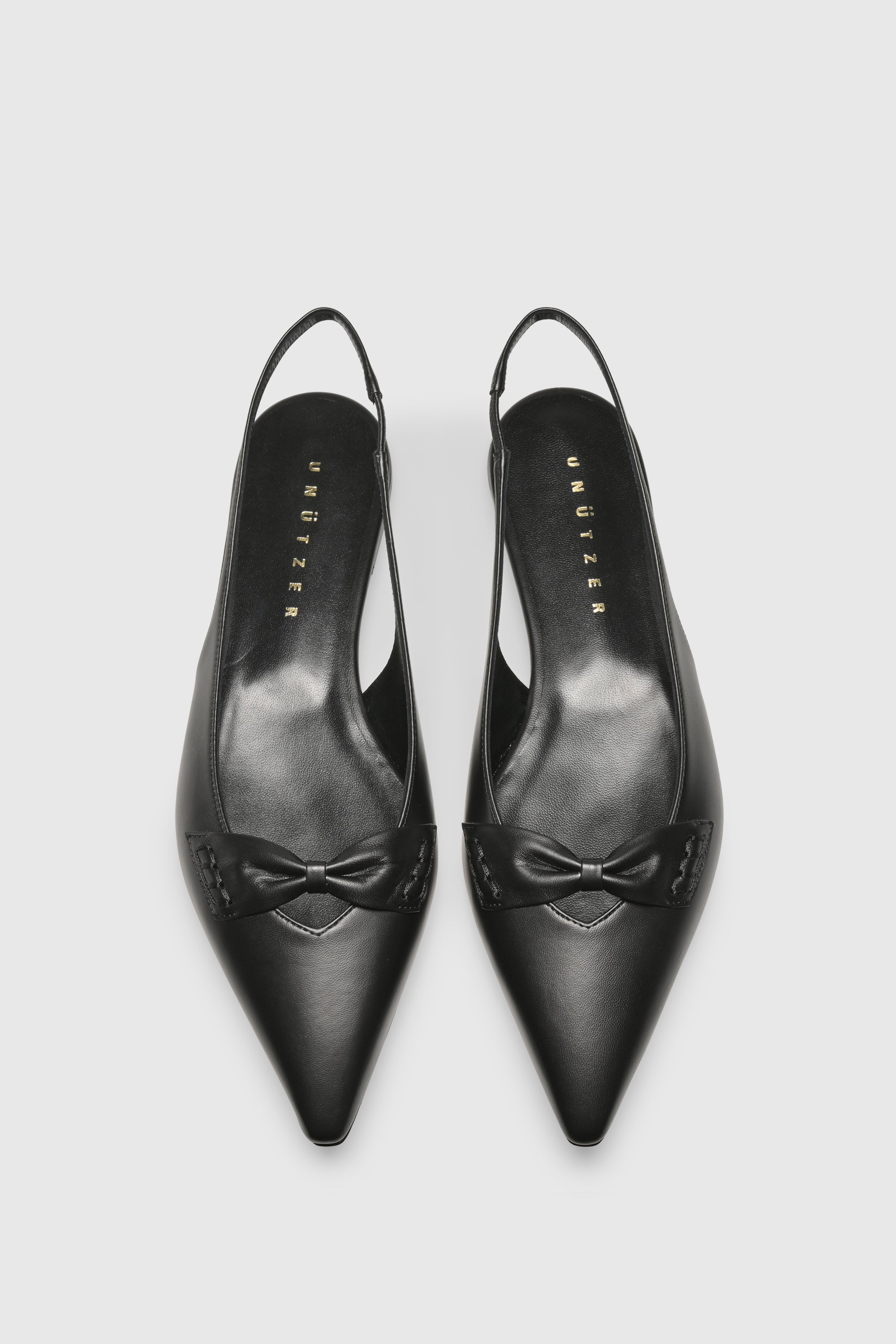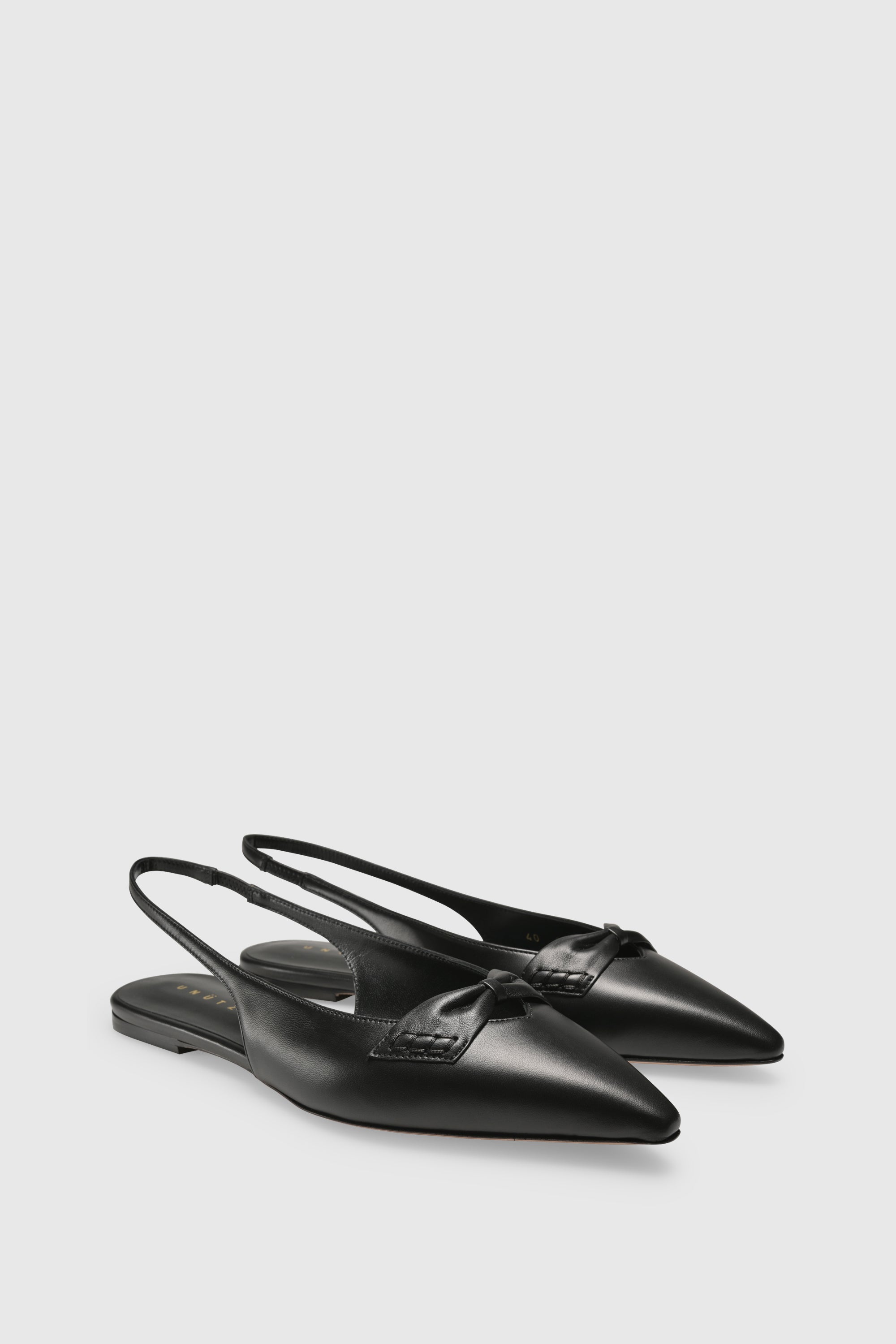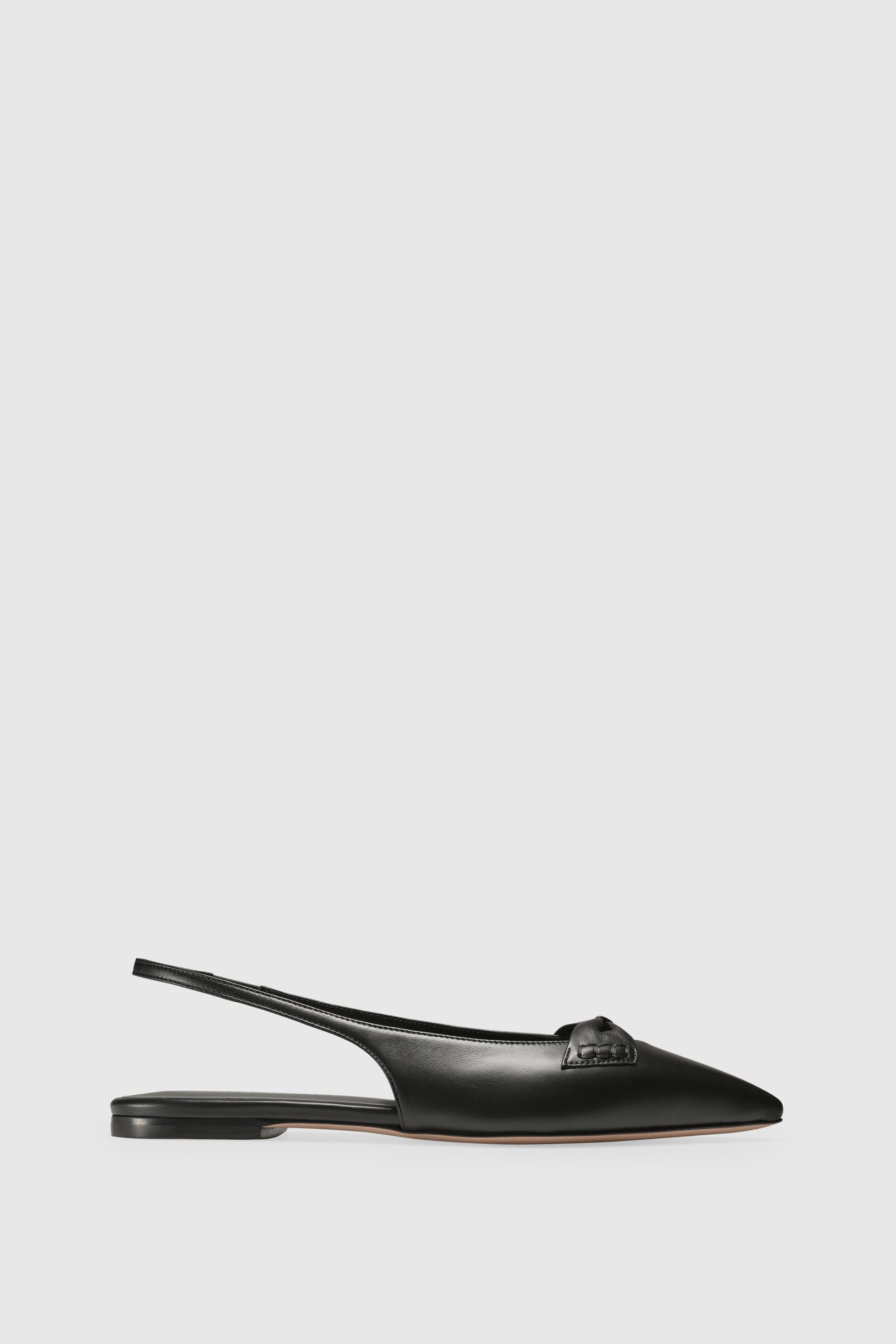 Der Slingback 9571 Nappa Black wird in Italien aus glattem schwarzem Nappaleder handgefertigt. Als Slingback-Flat gestaltet, verfügt er über eine spitze Zehenform, ein Lederschleifendetail sowie einen Slingback-Riemen mit elastischem Einsatz für einen sicheren und flexiblen Sitz.